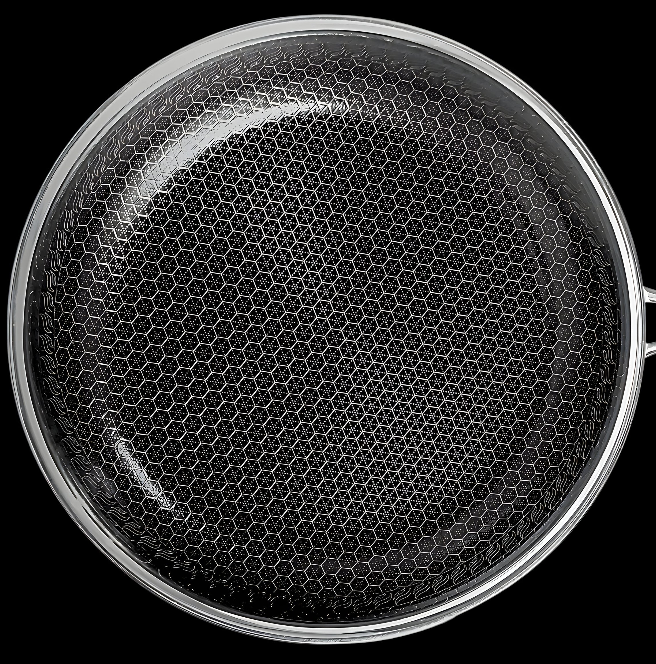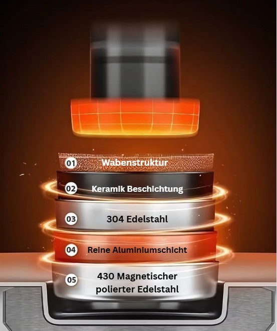Unsere Pfannen bestehen aus hochwertigem 304 Edelstahl mit einer PFOA-freien Antihaftbeschichtung und einer lasergravierten Wabenstruktur für bessere Performance.