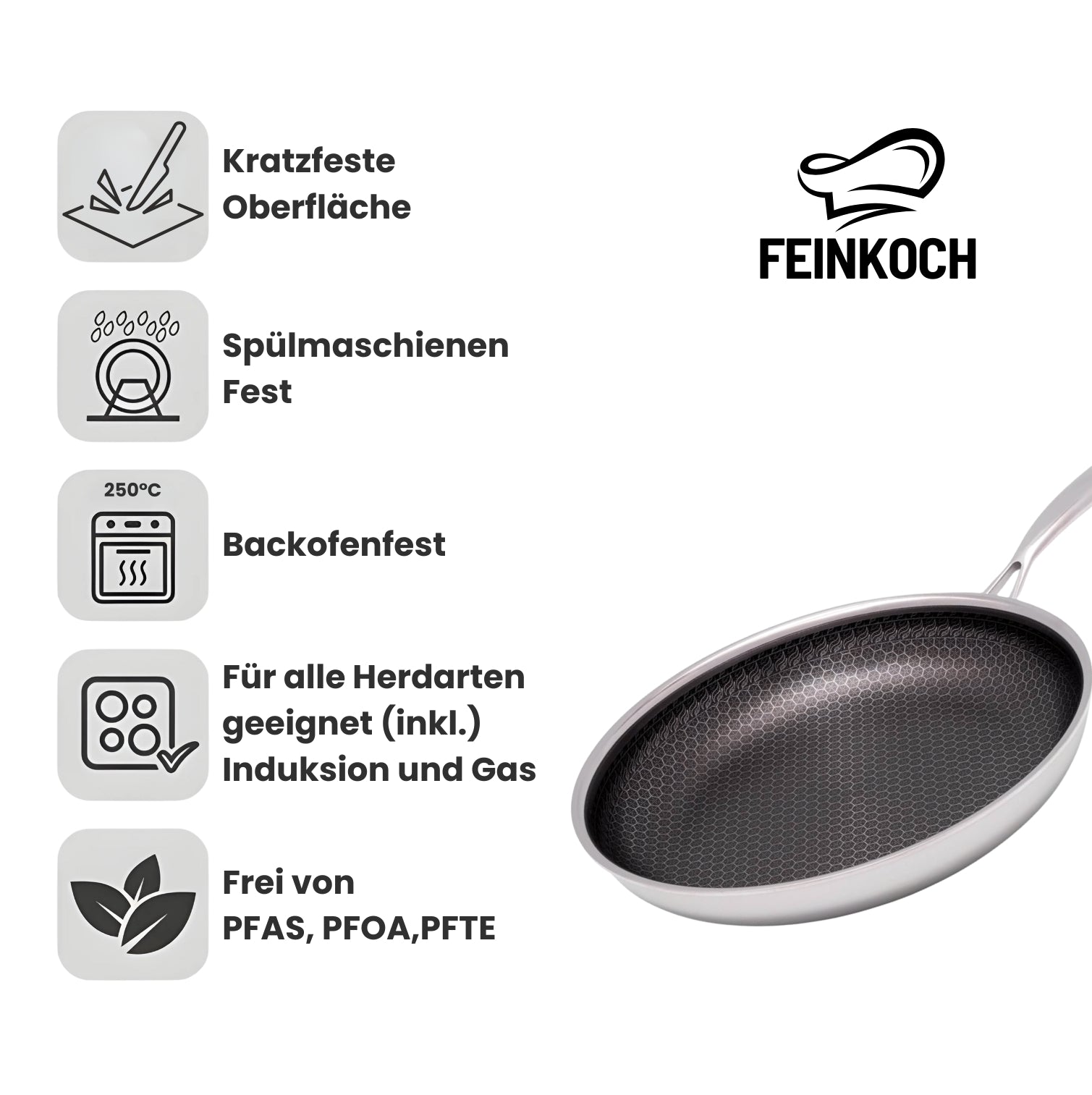 Die FEINKOCH Hybride Bratpfanne ist gemacht für tägliches Kochen mit echten Ergebnissen: starke Bräunung, weniger Anhaften, schnelle Reinigung. Die lasergravierte Wabenstruktur schützt die Oberfläche im Alltag und sorgt für gleichmäßige Hitzeverteilung damit Steak, Gemüse, Eier und Saucen kontrolliert gelingen. Der dreischichtige Aufbau bringt die Hitze schnell auf Temperatur und hält sie stabil. Backofenfest bis 250 °C SowieSpülmaschinenfest für eine stressfreie ReinigungGlasdeckel mit Dampföffnung für noch mehr Kontrolle beim Garen.